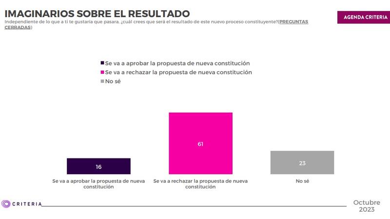 Asimismo, requeridos por un escenario, independiente de su preferencia, sobre qué creen que ocurrirá en diciembre, un 61% cree que se rechazará la nueva propuesta de Carta Magna, mientras un 16% espera que se apruebe y un 23% asegura no saber.