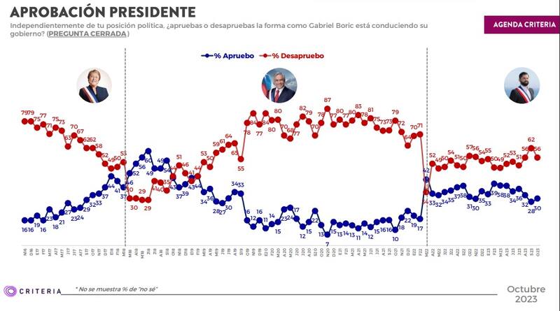 La encuesta Criteria también consultó respecto al escenario político y el gobierno del Presidente Gabriel Boric, quien en esta medición resultó con que un 30% aprueba como ha conducido su gestión, lo que significa un aumento de dos puntos frente a la medición del mes anterior.
