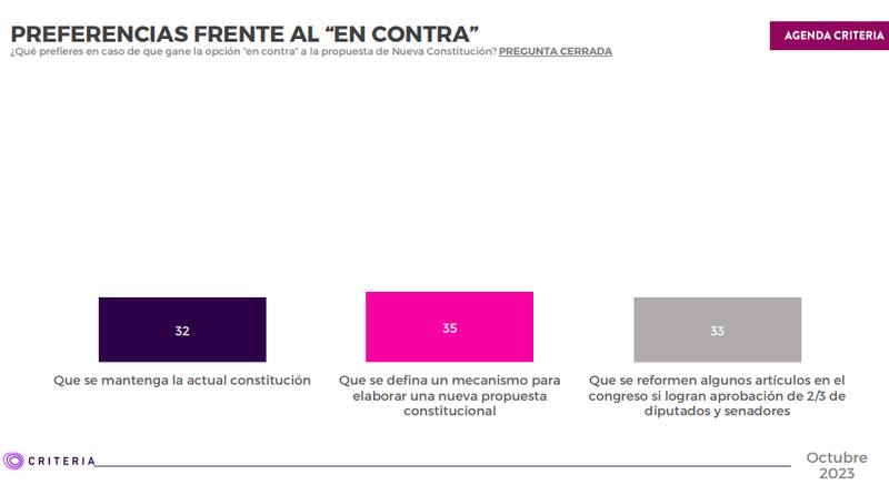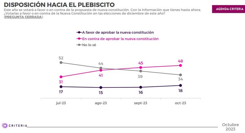 Este miércoles, se entregaron los resultados de una nueva encuesta Agenda Criteria con los resultados de octubre, donde un 48% de los encuestados se mostró “en contra” del nuevo texto constitucional que actualmente está en revisión por la Comisión Experta. El resultado supera por 30 puntos a quienes sí están por aprobar en diciembre próximo.