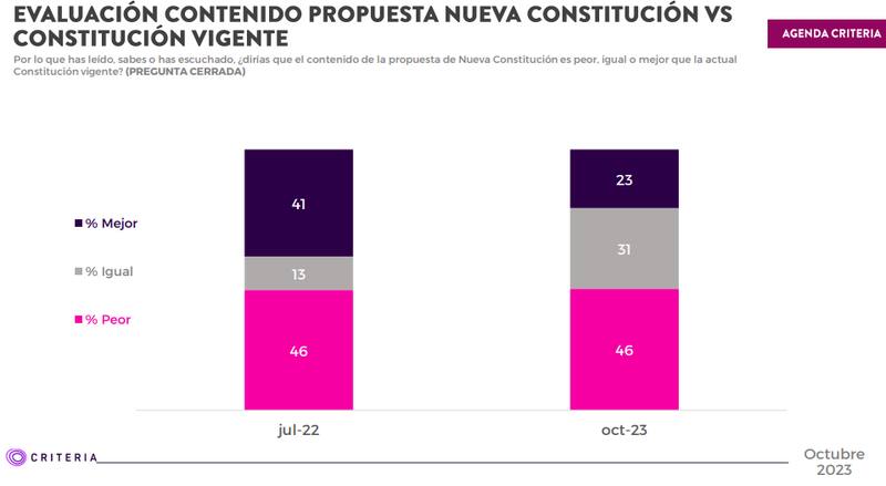 La medición arrojó que un 46% cree que el contenidos de la propuesta del actual proceso constitucional "es peor" que el de la Carta Magna vigente, y un 23% considera que es “mejor”.