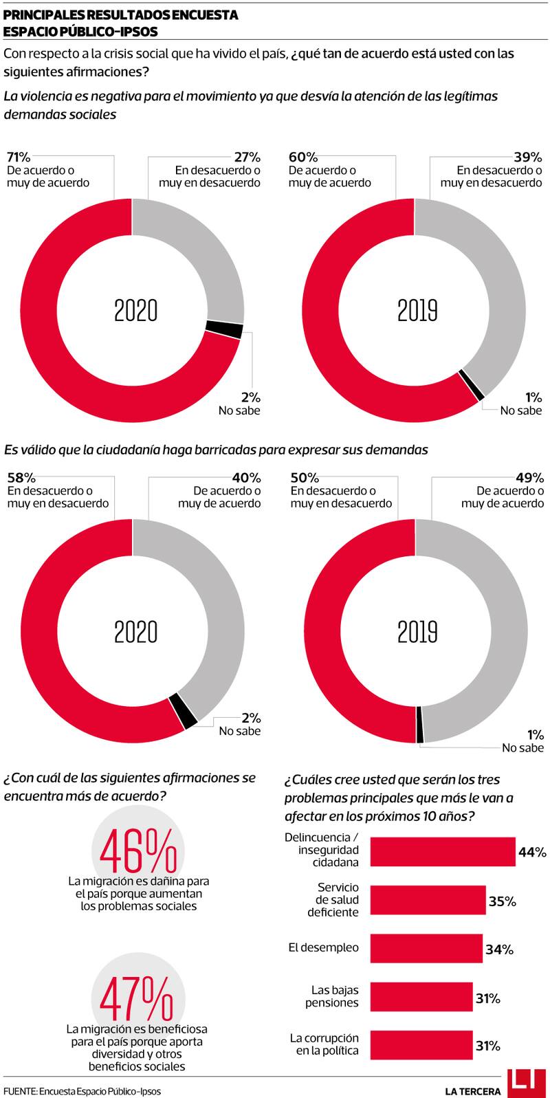 Este dato presentó un alza respecto del mismo sondeo realizado en 2019, cuando un 60% apoyó la idea. Además, bajó el porcentaje de personas de estiman válido hacer barricadas para expresar sus demandas. La disminución fue de 49% a 40% entre 2019 y 2020, respectivamente. Esto mismo ocurrió con el porcentaje de quienes están de acuerdo con que todo proceso de cambio requiere algún grado de violencia: la baja fue de 48% a 36%.
