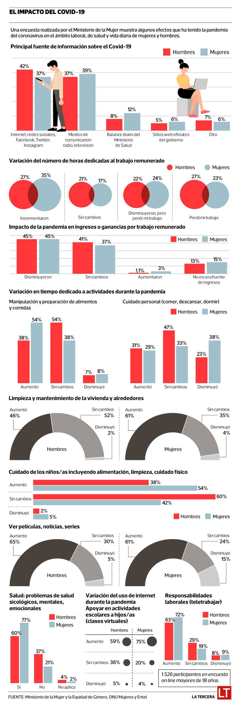 A nivel general, el 35% de las entrevistadas sostiene que su carga laboral aumentó en este periodo, en comparación con el 27% de los hombres que dan cuenta de lo mismo. Además, la mitad de los hombres y mujeres aclaran que sus ingresos han bajado en los últimos meses (ver infografía).