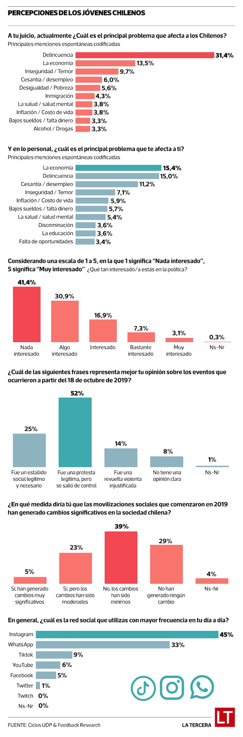 Desde 2009, el Centro de Investigación en Comunicación, Literatura y Observación Social (Ciclos) de la Universidad Diego Portales (UDP) ha monitoreado las principales preocupaciones y el perfil de los jóvenes chilenos. Y año tras año suele haber importantes cambios que dan cuenta de que el segmento entre 18 y 29 años no es sencillo de medir ni seguir: en el estudio de 2022 una mayoría tomó distancia de las demandas mapuches y la migración tras el estallido social, y en medio del proceso constituyente, en 2023, el 72% de los jóvenes que formaron parte de la Encuesta sobre participación, jóvenes y consumo de medios, manifestó sentirse inseguro en el país y un 49% abordó la necesidad de muchos cambios, pero de forma ordenada y estable.