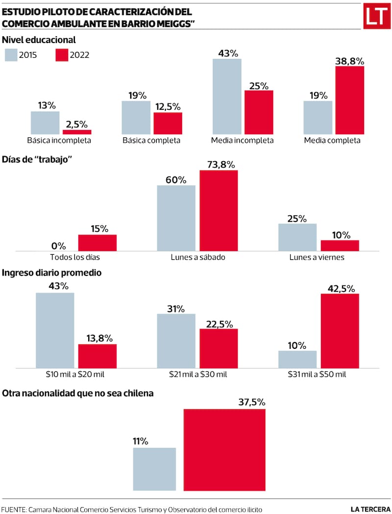 La investigación destacó que durante 2015 el 41% de los vendedores ambulantes contaba con educación media o superior y el 64% afirmó que dicha actividad era su única fuente de ingresos. El estudio reveló además que ante la posibilidad de recibir un sueldo líquido, el 28% dejaría de ser vendedor, siempre que este sea mayor a 500 mil pesos (en 2022 es de 21,3%). Además, en 2015 el 49% no estaba dispuesta a dejar de ser vendedor ambulante, mientras que en 2022 el 32,5% no dejaría la venta ilegal por ningún tipo de sueldo.