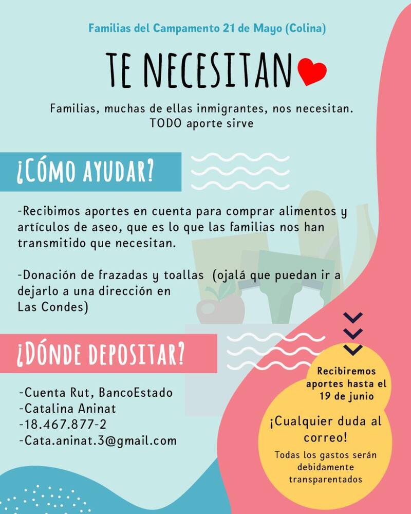 Se solicitan aportes económicos para familias del campamento 21 de mayo, en la comuna de Colina. Las ayudas son para comprar alimentos y artículos de aseo. También se reciben frazadas y toallas.