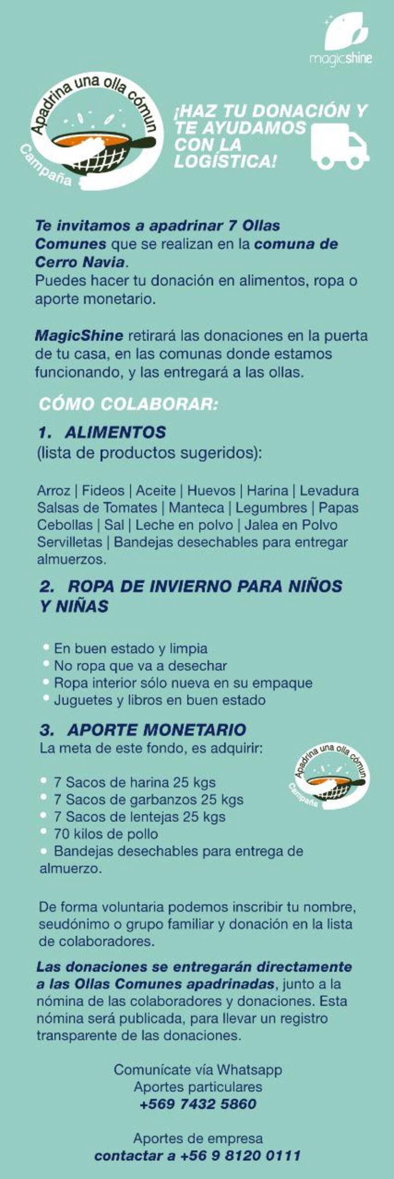 Agrupación Magic Shine invita a apadrinar siete ollas comunes en Cerro Navia. Se reciben aportes monetarios, de alimentos o ropa. Retirarán las donaciones a domicilio, en las comunas donde están funcionando.