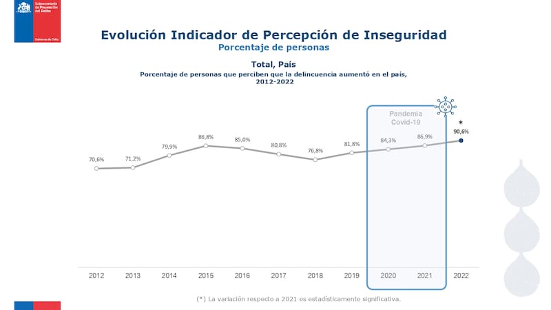 Según la Encuesta Nacional Urbana de Seguridad Ciudadana , las personas que perciben que la delincuencia aumentó en el país llega a 90,6%. Se trata de la cifra histórica más alta, pues en 2021 llegó a 86,9% y en 2015 a 86,8%. La Subsecretaría de Prevención del Delito dio a conocer los resultados del estudio y detalló su modernización: "Estamos hablando de una encuesta que mantiene la comparabilidad", resaltó el subsecretario Eduardo Vergara. Sobre los cambios metodológicos, aseguró que la nueva herramienta que se está aplicando "va a mantener estos estándares”.