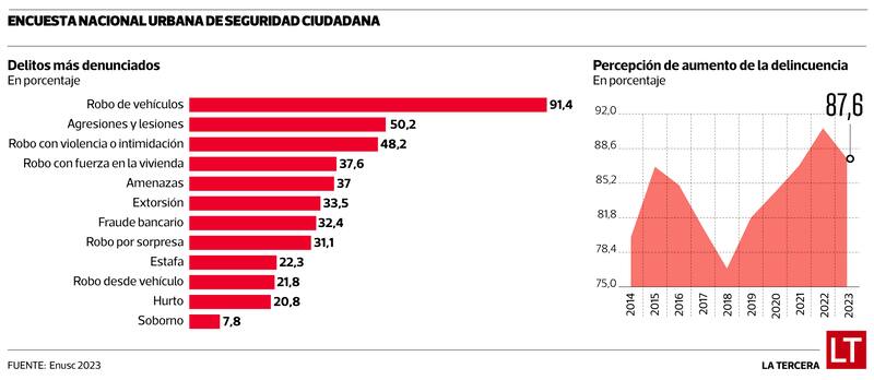 El robo de vehículos es el que representan el mayor índice de denuncia, con un 91,4%. Le sigue las agresiones (50,2%), el robo con violencia (48,2%), robo con fuerza en la vivienda (37,6%), entre otros (Ver infografía).