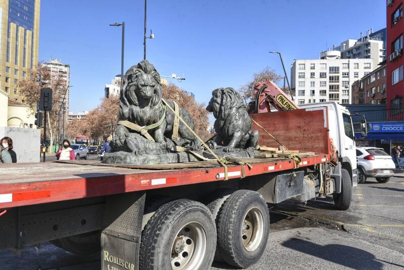 A más de un año de que fueran retiradas para su restauración, el emblemático par de esculturas de leones de Providencia regresó a este lunes a su habitual ubicación frente a la Catedral Castrense.