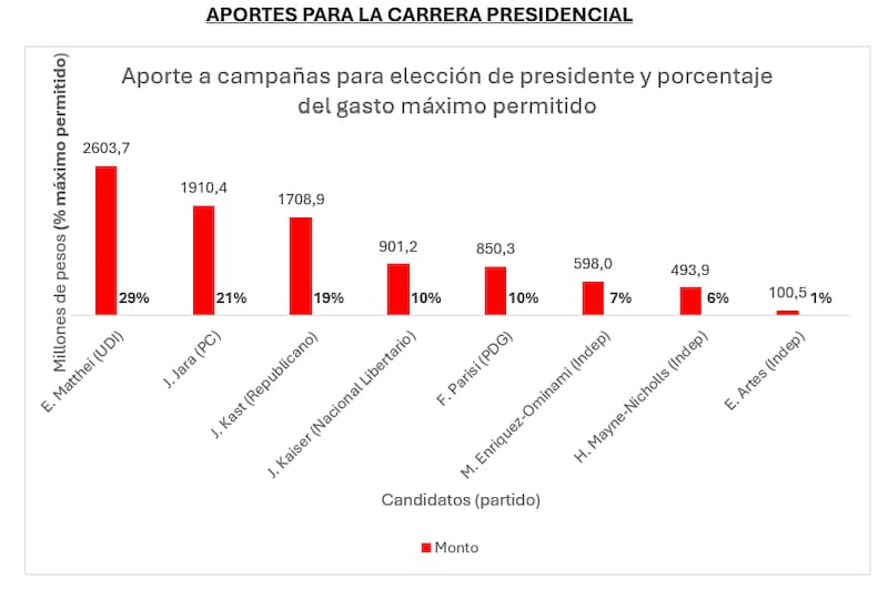 El que menos aportes contabiliza es Eduardo Artés (IND), con $ 100 millones.