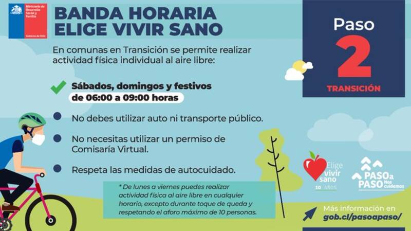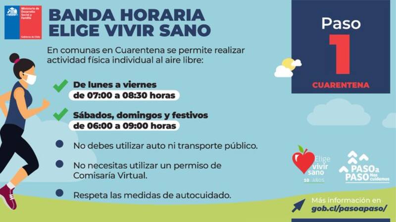 Si bien actividades como realizar compras, asistir a horas médicas no urgentes, o pasear a las mascotas, ya no se pueden realizar con la suspensión de esta autorización general, uno de los aspectos que se mantuvieron corresponde a la banda horaria Elige Vivir Sano.