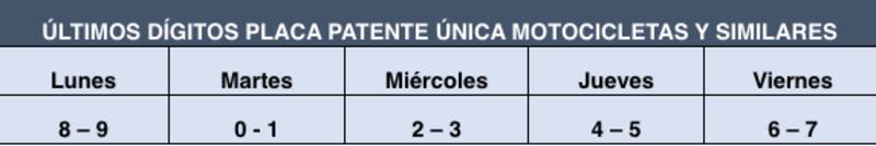 En el caso de las motocicletas inscritas con anterioridad al 1° de septiembre del 2010, la prohibición de circular al interior del anillo de Américo Vespucio, también se aplicará a dos dígitos diarios, como se indica en la siguiente tabla: