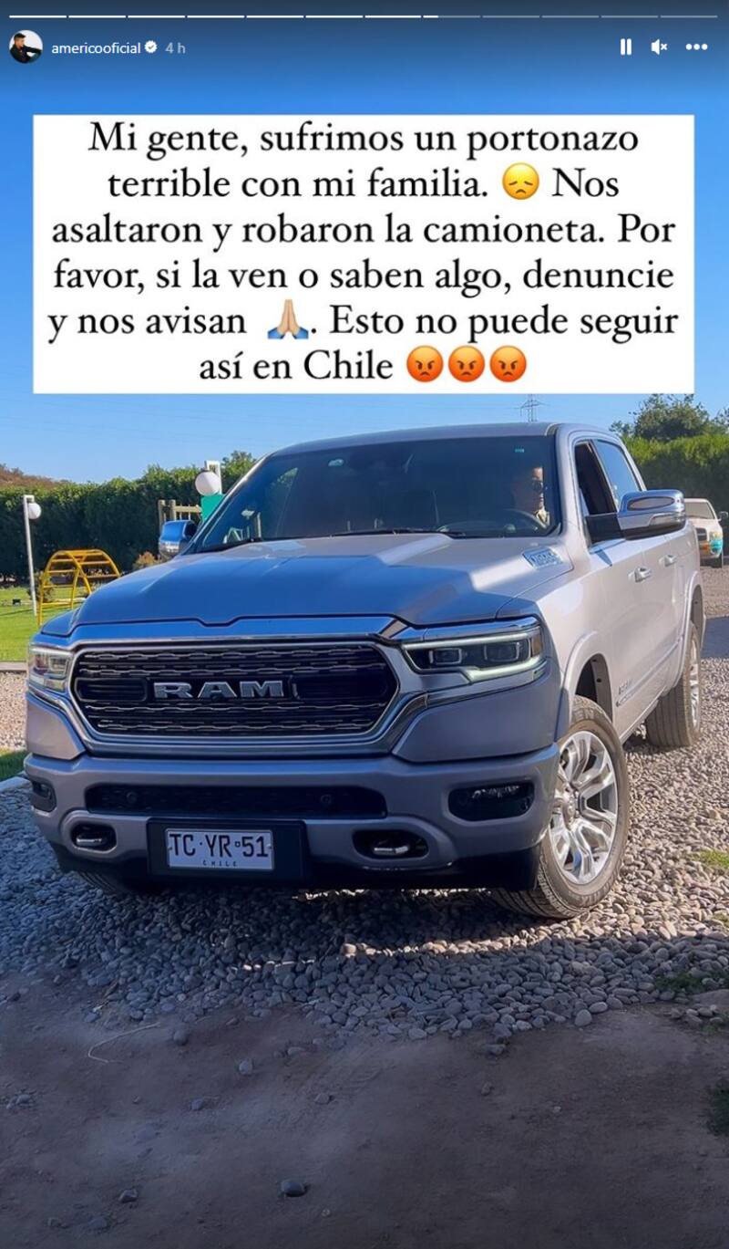 El artista también realizó una publicación a través de su cuenta de Instagram donde señaló: “Mi gente, sufrimos un portonazo terrible con mi familia. Nos asaltaron y robaron la camioneta. Por favor, si la ven o saben algo, denuncie y nos avisan. Esto no puede seguir así en Chile”, escribió.