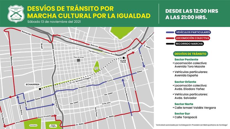 Por ello, carabineros ha implementado desvíos de tránsito para permitir el desplazamiento expedito, tanto de las personas que asistan a la marcha como también de los vehículos particulares y la locomoción colectiva. Estos funcionarán desde las 12.00 y hasta las 21.00 horas.
