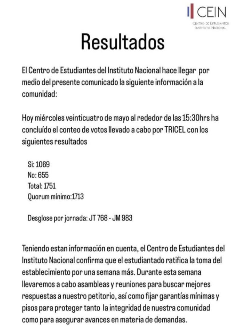 Y es que tras una votación que se llevó a cabo la tarde del martes, este miércoles el Tribunal Calificador de Elecciones del Instituto Nacional procedió al conteo de votos, el que superó apenas el quorum (hubo 1.751 votos y se requerían 1.713) y determinó que sobre el 60% apoyó continuar con la medida, lo que se notó con fuerza en los cursos más grandes.