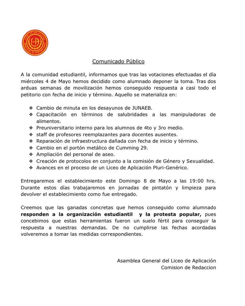 Durante la tarde de este jueves, la asamblea general del Liceo de Aplicación de Santiago informó que tras las votaciones efectuadas el miércoles se decidió deponer la toma tras dos semanas de movilizaciones. Eran, hasta aquí, uno de los 12 establecimientos que ya se han movilizado durante 2022.