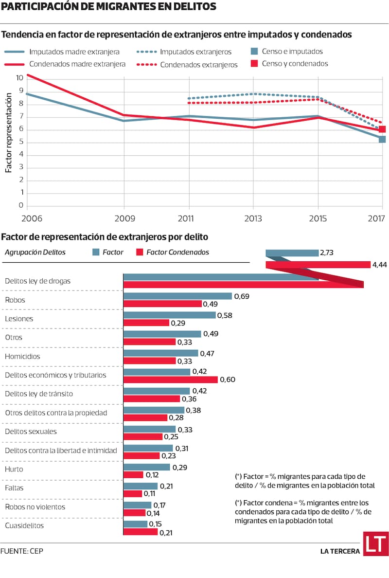 El texto explica que “el gran flujo de inmigrantes al país en los últimos años no ha venido acompañado de un aumento en su participación en delitos, sino lo contrario” (ver infografía). En esa misma línea, los autores señalan que “los datos para Chile son contrarios a la creencia, extensamente compartida, de que los inmigrantes elevarían los índices de criminalidad: los extranjeros en Chile participan poco en delitos y, es más, su participación ha venido cayendo en años recientes”.
