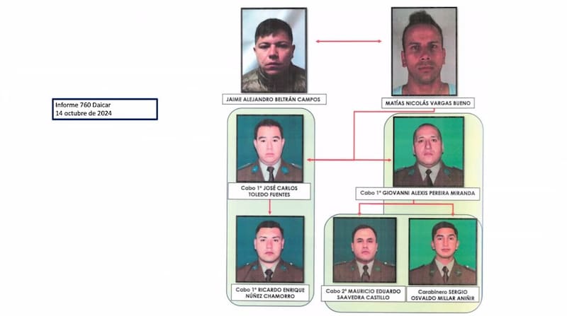 El cabo primero Giovanni Pereira Miranda fue el nexo y tenía la misión de reclutar a otros uniformados de Rancagua para diversas labores que contribuyeran al robo. Así llegaron los cabos primero Ricardo Núñez Chamorro, José Toledo Fuentes, el cabo segundo Mauricio Saavedra Castillo y el carabinero Sergio Millar Aniñir. En esa reunión inicial estuvieron presentes los imputados que hoy se encuentran en prisión preventiva, Óscar Orellana (guardia de Brinks) Juan Ramírez, Matías Vargas Bueno y Jaime Beltrán Campos, este último sindicado por la Fiscalía como el líder de la agrupación criminal.