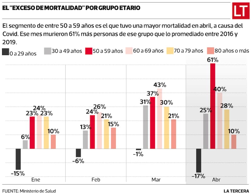 Según el análisis de esta variable, en el mes de abril el grupo personas de entre 50 a 59 años tuvo un exceso de mortalidad del 61%; es decir, la muerte de persona de este tramo de edad aumentó en un 61% ese mes, en comparación a los meses de abril de entre 2016 y 2019. En abril del año pasado, cuando la pandemia estaba comenzando, el exceso de mortalidad de este tramo fue del 7%.