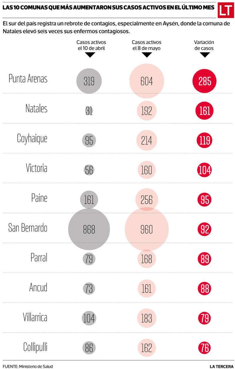 Sin embargo, los casos han aumentado con fuerza en la zona sur del país, específicamente en Punta Arenas, que sumó 285 casos activos en un mes y hoy tiene 604. También enfrentan un fuerte rebrote las comunas de Natales y Coyhaique, ambas con un aumento de más de 100 casos en un mes (ver infografía).