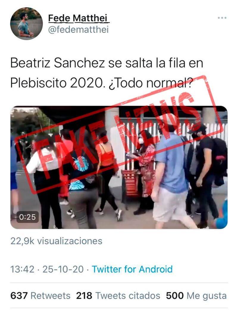 “Beatriz Sánchez se salta la fila en Plebiscito 2020. ¿Todo normal?”, escribió el usuario que compartió el video, en el que se escucha a algunas personas reclamar contra Sánchez por no hacer la fila. El registro también fue difundido por el excandidato José Antonio Kast.