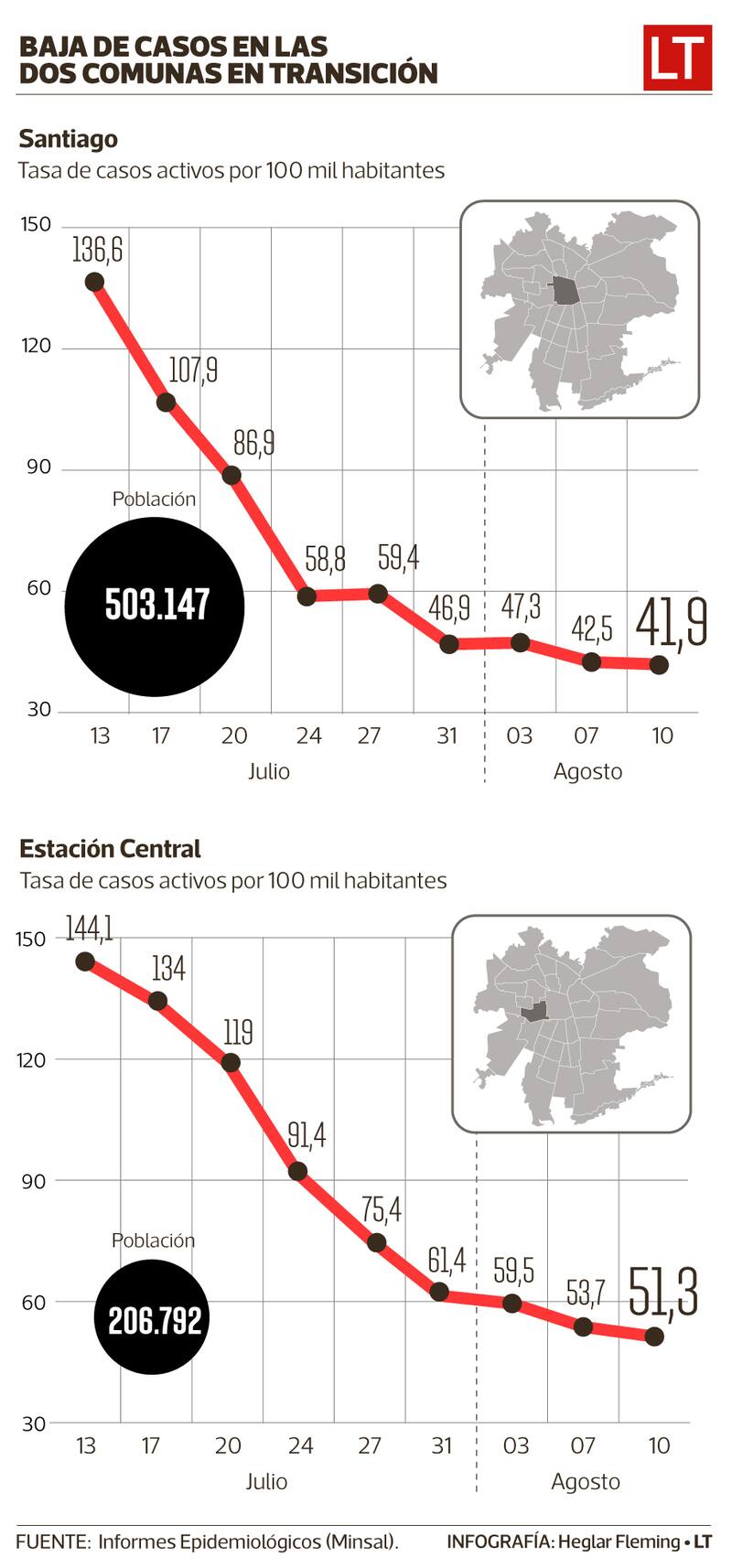 La cantidad de personas que diariamente transitan por estas dos comunas fue el principal obstáculo de la autoridad sanitaria para decretar antes su avance a la etapa de transición. De hecho, la misma subsecretaria Paula Daza aseguró que la población flotante de Santiago, que ella calculó en 1.500.000 personas al día adicionales a sus habitantes, hacía aún más complejo manejar un escenario de libre circulación de lunes a viernes, y que implicara reactivar la actividad económica en la zona. Esa población se agrega a los 709.939 habitantes que suman ambas comunas.