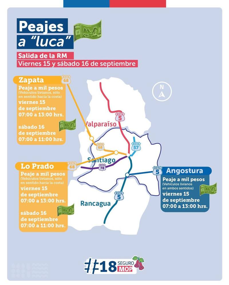 Además, en Angostura el peaje estará a mil pesos para vehículos livianos en ambos sentidos el viernes 15 de septiembre entre las 7.00 y 13.00 horas.