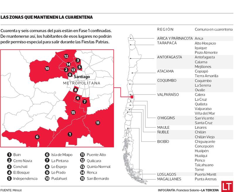 De mantenerse en esa fase, los habitantes de esas zonas no podrán contar con el permiso para reunirse en Fiestas Patrias. Para el resto de las comunas -las que se mantienen en Fase 2, 3, 4 y 5-, el permiso especial, que debe ser tramitado, les permitirá participar de reuniones con aforo máximo de cinco personas extras a la familia que habita ese lugar (recintos cerrados) y 10 en el caso de espacios abiertos. Entre el 17 y 20 de septiembre, además, se adelantará el toque de queda de las 23.00 a las 21 horas, con el propósito de desincentivar festejos nocturnos. Están prohibidas las fondas y los eventos masivos, además de los desplazamientos a segundas viviendas. La autoridad anunció que instalará cordones sanitarios en las salidas de Santiago y principales carreteras del país.