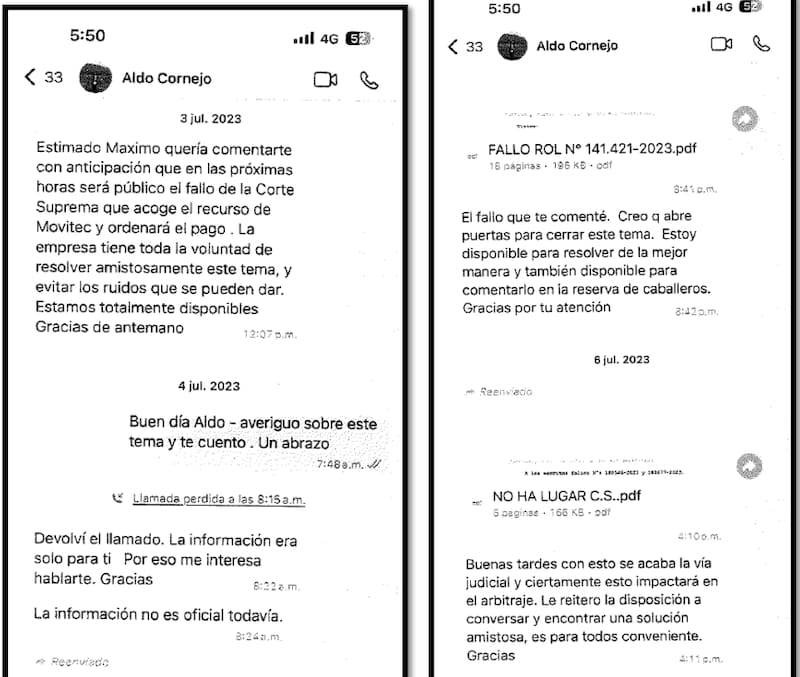 Con esa información, Lagos le habría pedido a Aldo Cornejo que también interviniera, para que le informara a Máximo Pacheco de los avances de la causa y así pudieran alcanzar un “acuerdo amistoso”.