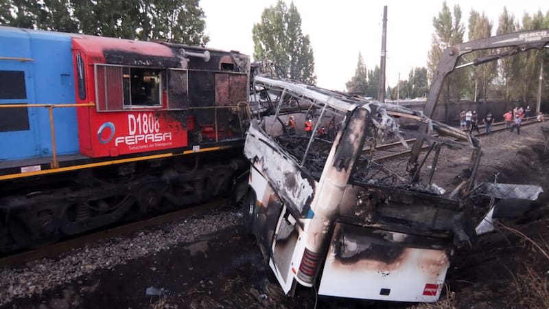 El hecho tuvo lugar en el cruce ferroviario de calle Los Cipreses y el bus interurbano fue arrastrado alrededor de 80 metros terminando completamente consumido por el fuego.