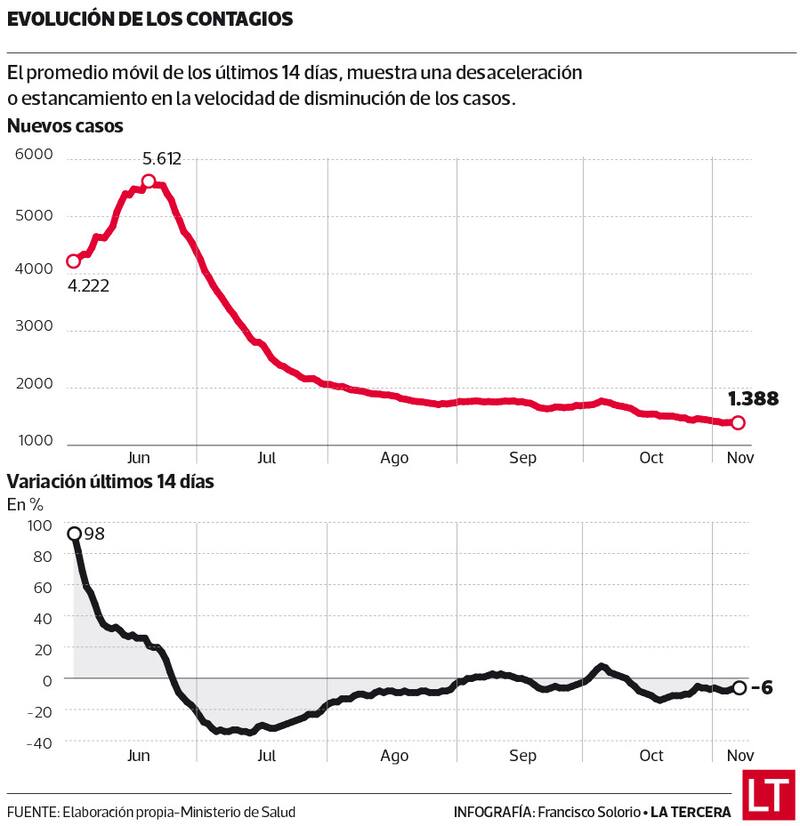 El epidemiólogo Gabriel Cavada explica que una curva “teórica” del desarrollo de la pandemia en el país debería haber tenido a Chile con 200 casos semanales a fines de octubre e inicios de noviembre. Sin embargo, acota que la circulación del virus ya es endémica y que si bien “seguimos bajando, lo hacemos muy lentamente. Se proyecta una reducción de 2%-3% de casos por semana. Si eso continúa así, deberíamos esperar un rebrote para febrero, luego de enero, tras las vacaciones”.