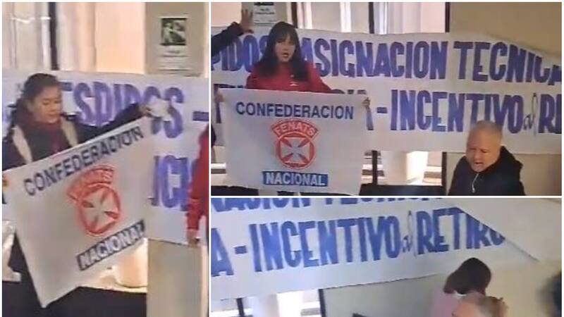 La Confederación Fenats Nacional desplegó pancartas en el lugar para manifestarse y buscar poder hablar con la ministra de Salud Ximena Aguilera.