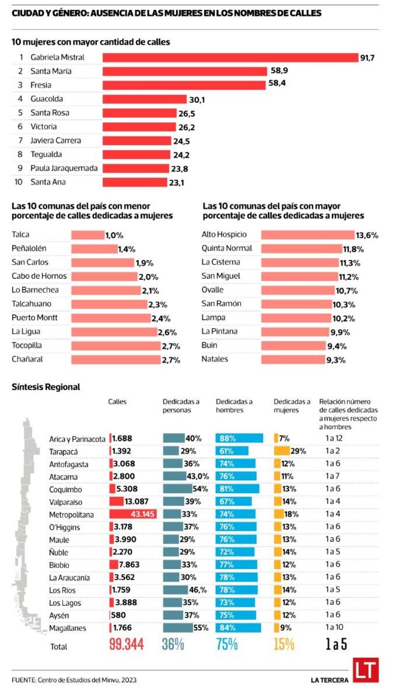 Según datos del Centro de Estudios de Ciudad y Territorio del Minvu, el 42% de las vías lleva por denominación el nombre y apellido de una mujer y el 30% de una religiosa o santa. Según la ley, son los municipios los que cuentan con la facultad para nombrar las arterias que les corresponde.