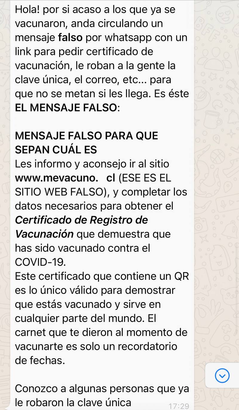 Tras viralizarse durante esta jornada en la red social Whatsapp un mensaje que advertía que el sitio mevacuno.cl era falso y que robaba las claves únicas de los usuarios, desde el Gobierno salieron a desmentir esta información e indicaron que se trata de una página legítima y segura.