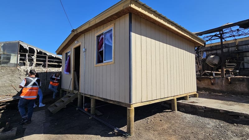 Por su parte, Estay detalló las condiciones de las viviendas de emergencia: “Tiene una superficie de 24 metros cuadrados con un baño de 2.5 metros. Es una vivienda que tiene dos ambientes más este baño y que adicionalmente nosotros complementamos con un kit de habitabilidad que tiene dos camas de una plaza con sus respectivos colchones, frazadas, almohadas, más una cocinilla, losa, entre otros elementos que permiten la habitabilidad de la vivienda”.