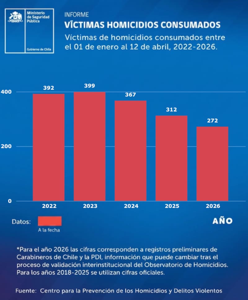A nivel anual, sin embargo, se registra una disminución. Desde el 1 de enero de este año al 12 de abril, y comparado al 2025, se registra una disminución del 12,8% en las víctimas de este ilícito, pasando de 312 personas fallecidas a 272 este año. Lo anterior, siguiendo la tendencia de caída sucesiva de las víctimas de este delito desde las 392 el 2022, 399 el 2023 y 367 el 2024.