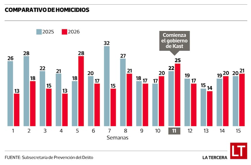 En su primera entrega, la subsecretaria de Prevención del Delito, Ana Victoria Quintana, informó la cifra de víctimas de homicidios que se han reportado en las 15 semanas de este año y desde que asumió la administración del Presidente José Antonio Kast. Según las estadísticas del Ministerio de Seguridad, encabezada por la ministra Trinidad Steinert, desde que el Mandatario asumió su cargo y hasta el mediodía del 12 de abril, se han registrado 97 víctimas de homicidio, dos más que el mismo periodo de 2025, lo que equivale a un 2,1% más.