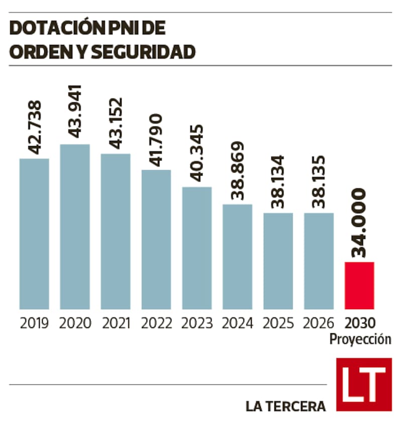 Los PNI, donde está la mayoría de los carabineros que “salen a la calle”, es donde se han levantado las alertas tanto en el gobierno como en la institución, principalmente tras el estallido y la pandemia. Lo anterior, porque si en 2020 había 43.941 funcionarios de dicho rango dedicados a labores de “orden y seguridad”, desde entonces ese número ha tenido una drástica caída, llegando a 38.134 en 2025 y se estima que este año concluiría con 38.135.