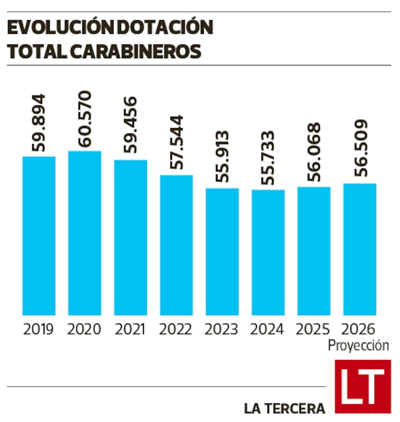 Según fuentes que saben del tema, la drástica caída en dicho número de funcionarios demuestra que -en promedio- se han perdido casi mil carabineros por año, lo que de continuar con la tendencia dejaría en una preocupante cifra de 34 mil funcionarios al 2030, logrando perder 10 mil policías.