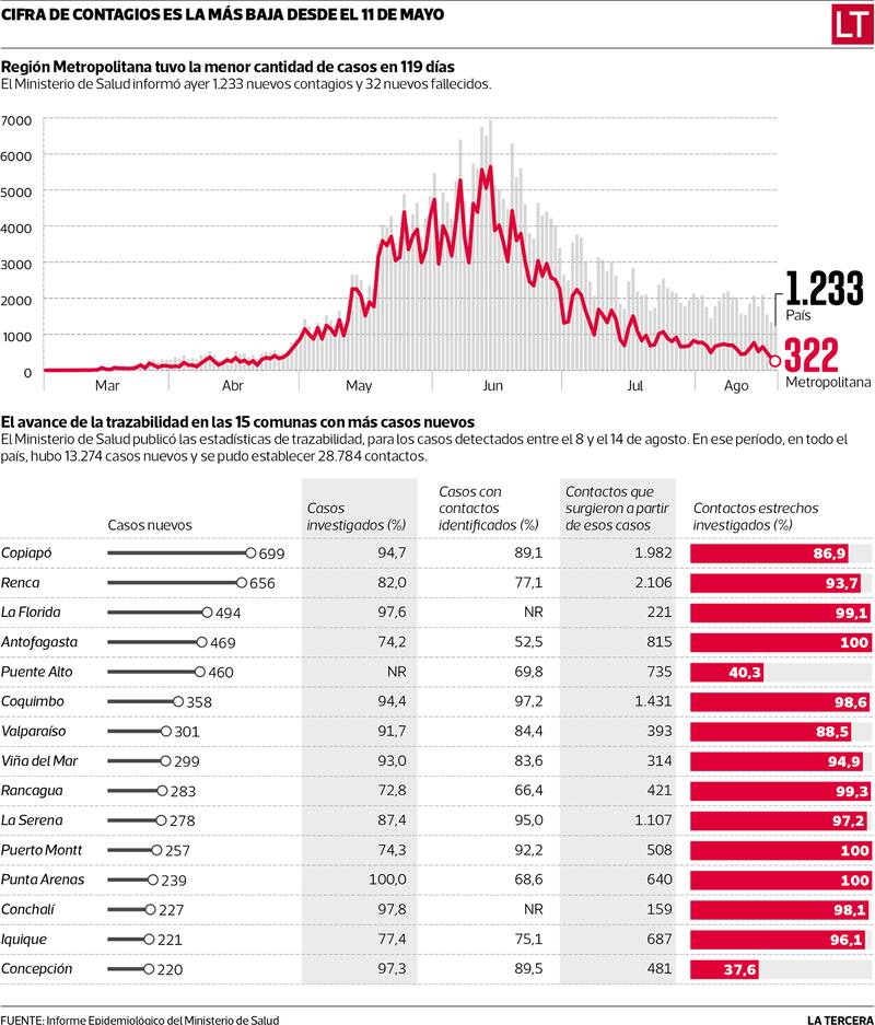 El informe detalló el nivel de trazabilidad de los casos que reportan las seremis. Según ese análisis, entre el 8 y el 14 de agosto se detectaron en el país 13.274 personas contagiadas que, a su vez, identificaron a 28.784 contactos estrechos. De ese grupo, 24.948 personas (87%) fueron investigadas antes de 48 horas, indicador sindicado como clave para controlar la pandemia.