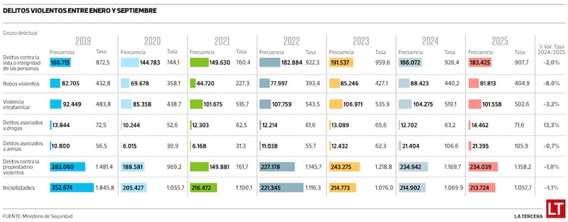 El periodo analizado por la repartición de gobierno, a partir de cifras de “casos policiales” entregados por Carabineros y la Policía de Investigaciones (PDI) al Centro de Estudios y Análisis del Delito (CEAD) de la Subsecretaría de Prevención del Delito (SPD), comprende los meses entre enero y septiembre de esta año, mismo periodo con el que es comparado con años anteriores desde 2019 a la fecha.