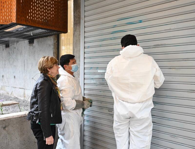 Personal de limpieza de la Municipalidad de Providencia llegó hasta el edificio para efectuar labores de aseo.