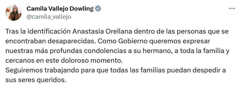 “Tras la identificación Anastasia Orellana dentro de las personas que se encontraban desaparecidas. Como Gobierno queremos expresar nuestras más profundas condolencias a su hermano, a toda la familia y cercanos en este doloroso momento. Seguiremos trabajando para que todas las familias puedan despedir a sus seres queridos”, publicó.