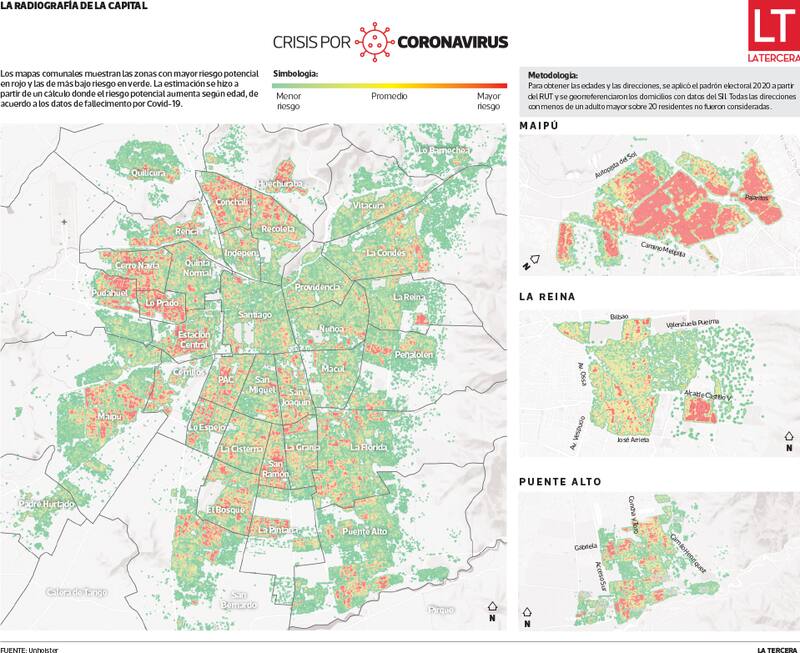 De hecho, si bien el estudio es concordante en el hecho de que municipios como los dos últimos, La Pintana, La Granja, Pedro Aguirre Cerda, Recoleta, El Bosque y San Ramón -entre los que tienen mayor cantidad de casos activos por habitante- aparecen con alta concentración de población de riesgo, también advierte de bolsones complejos en otras comunas que al menos hasta los últimos informes epidemiológicos aparecen en una mejor posición relativa, como Pudahuel o Maipú.