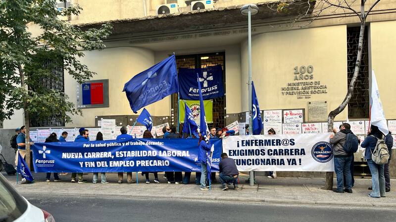 Esta mañana, los gremios de la salud Fenats Nacional, Fenpruss, Fenasenf y Confedeprus llegaron hasta el edificio del Ministerio de Salud ubicadas en Santiago centro, para manifestarse con pancartas y lienzos acusando incumplimiento de parte del gobierno en materia de carrera funcionaria.