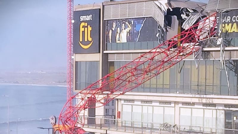 La estructura se derrumbó sobre el techo del recinto Smart Fit, emplazado en la planta superior de un strip center, frente al Mall Plaza de Arica. La víctima fatal correspondería al operario de la grúa.