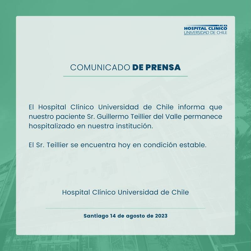 “El Hospital Clínico Universidad de Chile informa que nuestro paciente Sr. Guillermo Teillier del Valle permanece hospitalizado en nuestra institución”, dijeron a través de un comunicado de prensa, agregando que “se encuentra hoy en condición estable”.