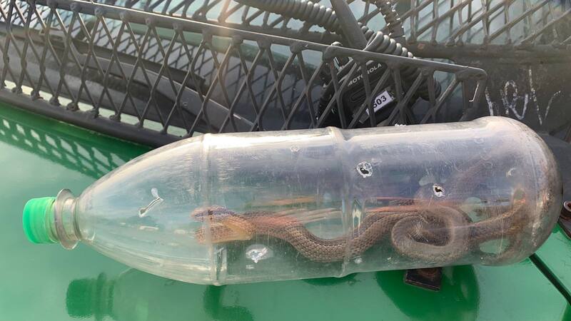 Un vecino de La Granja, mientras se desplazaba esta tarde por calles de la comuna, encontró una botella plástica que contenía en su interior una culebra, la que entregó a personal de Carabineros.