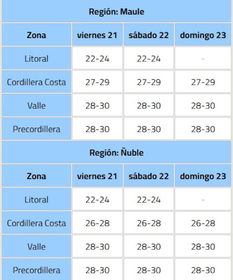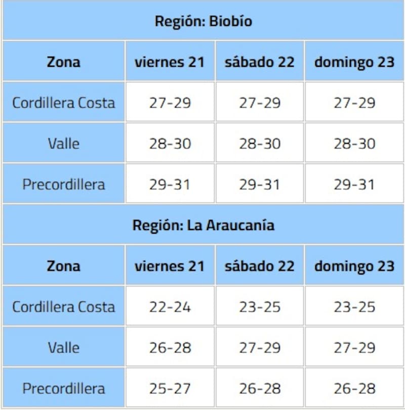 Esto generaría un significativo aumento en las temperaturas máximas durante los próximos días viernes 21, sábado 22 y domingo 23 de noviembre, en los sectores precordilleranos, valles y la cordillera de la costa de las regiones de Biobío y La Araucanía.