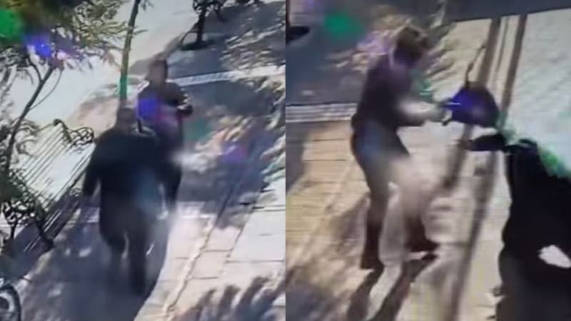 Según se ve en las cámaras de seguridad, el delincuente aborda a la víctima por la espalda y le propicia múltiples golpes en la cabeza con la empuñadura de un arma, aparentemente de fuego.